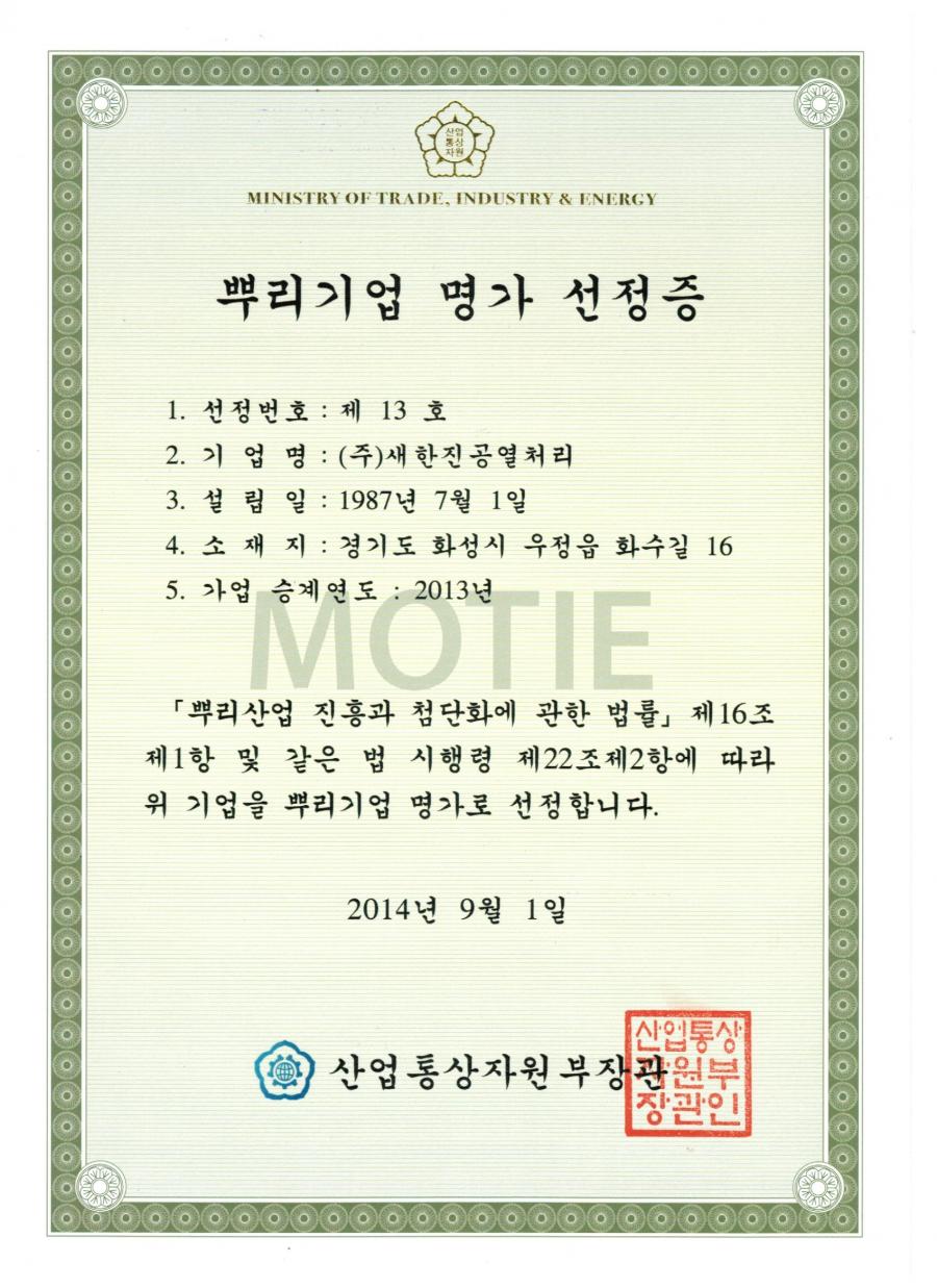 산업통상자원부 2014뿌리기업 명가 선정되었습니다.
